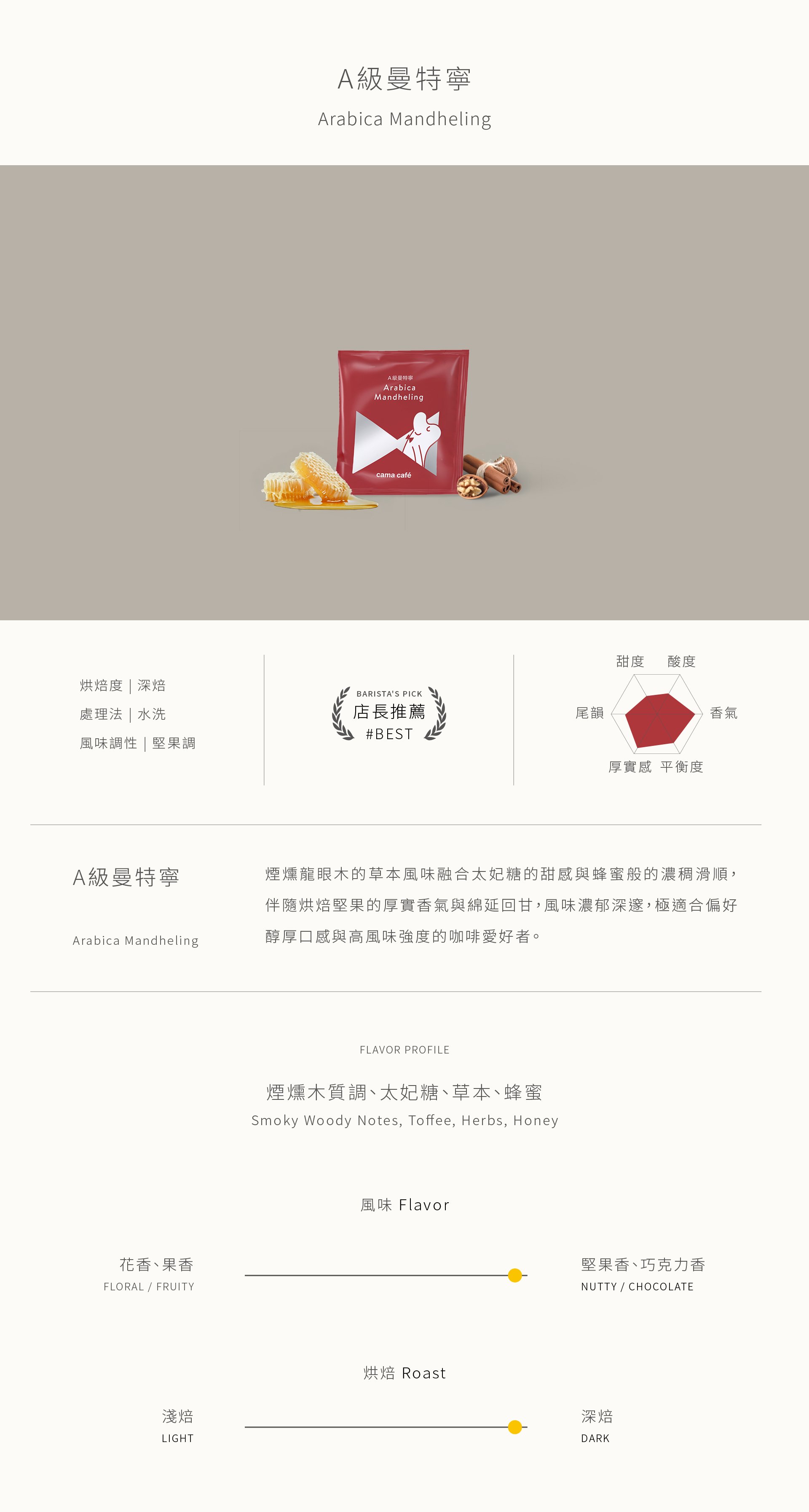煙燻龍眼木的草本風味融合太妃糖的甜感與蜂蜜般的濃稠滑順,伴隨烘焙堅果的厚實香氣與綿延回甘,風味濃郁深邃,極適合偏好醇厚口感與高風味強度的咖啡愛好者。