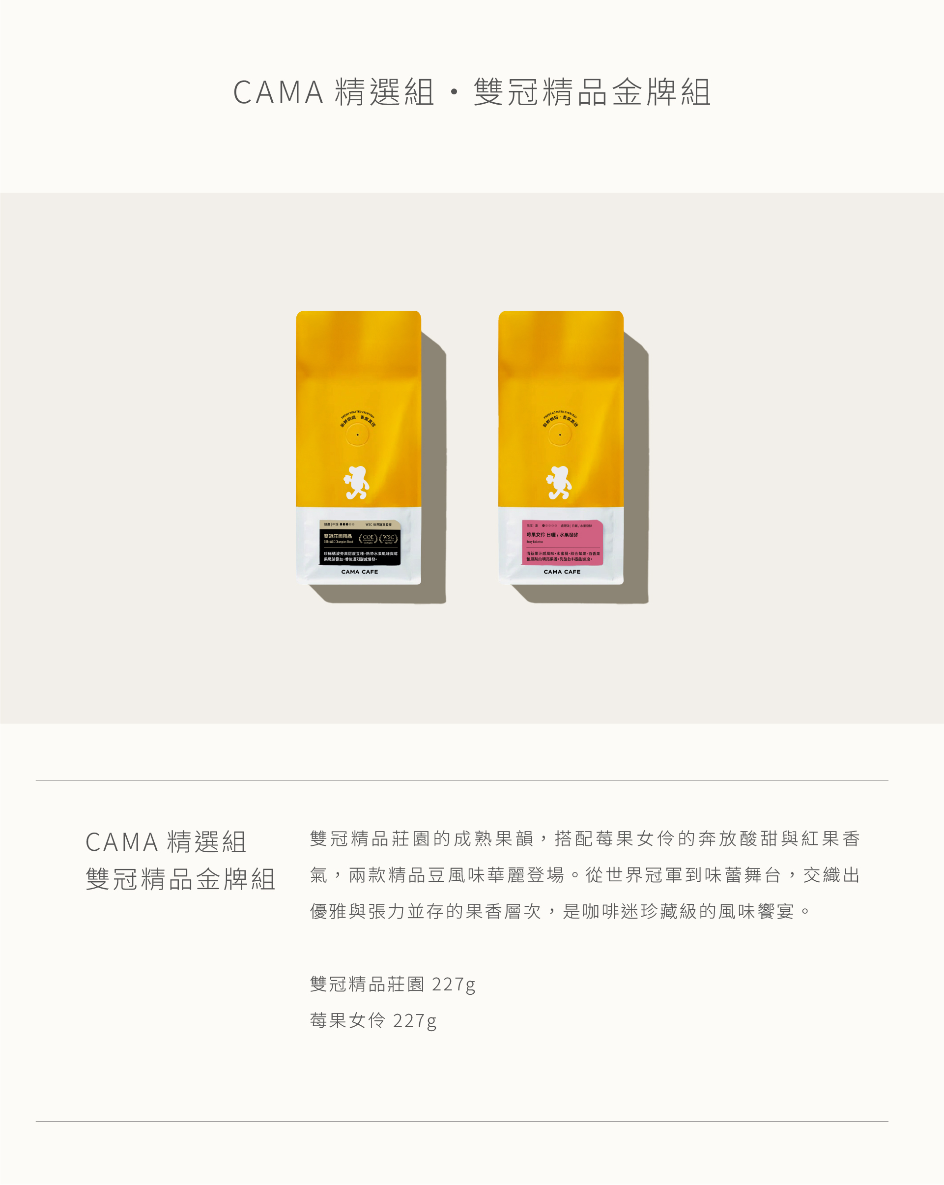 雙冠精品莊園的成熟果韻,搭配莓果女伶的奔放酸甜與紅果香氣,兩款精品豆風味華麗登場。從世界冠軍到味蕾舞台,交織出優雅與張力並存的果香層次,是咖啡迷珍藏級的風味饗宴。