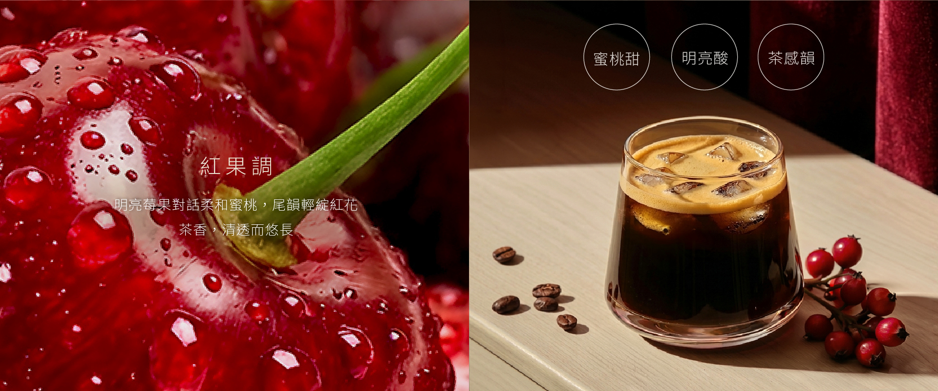 明亮莓果與甜桃交織,蜜桃乾甜感圓潤,尾韻帶紅花與紅茶香氣,層次細緻。