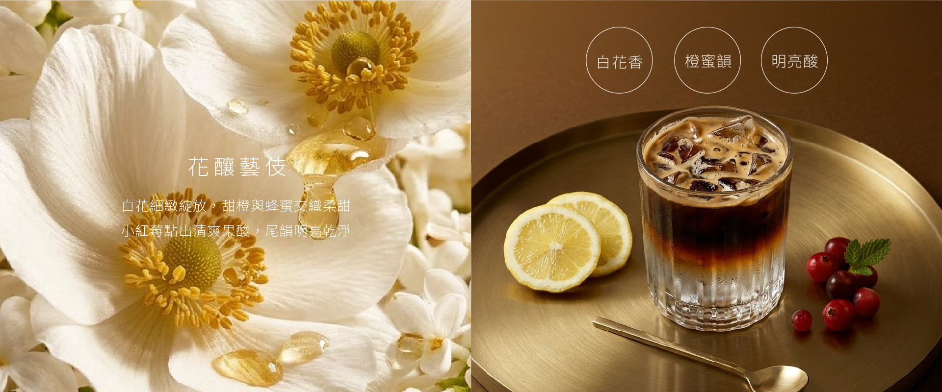 白花香氣細緻乾淨,甜橙與蜂蜜交織出柔和甜感,小紅莓點綴清爽果酸,整體清新優雅,尾韻乾淨明亮,是經典水洗藝伎的平衡之作。