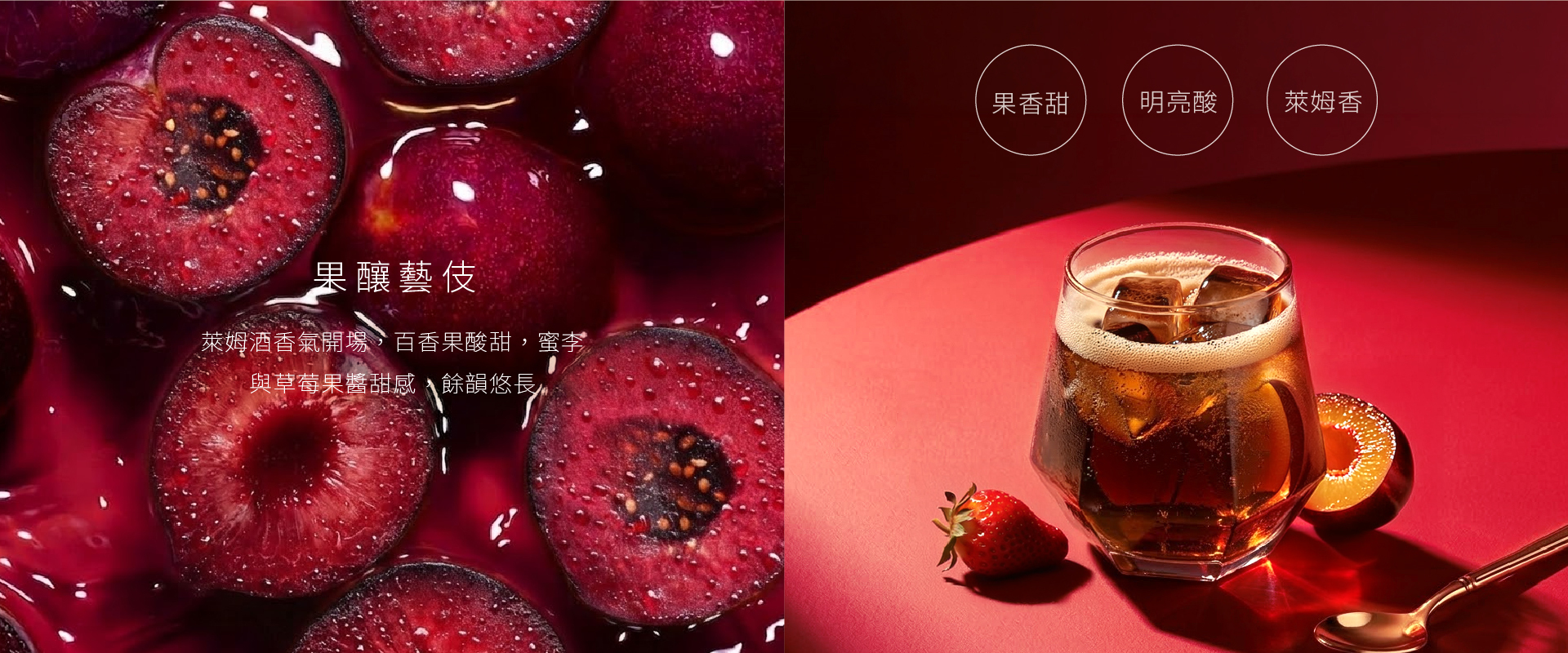 萊姆酒香氣開場,百香果的熱帶酸甜明亮奔放,蜜李與草莓果醬甜感層層堆疊,口感濃郁如水果釀酒,餘韻甜潤飽滿。