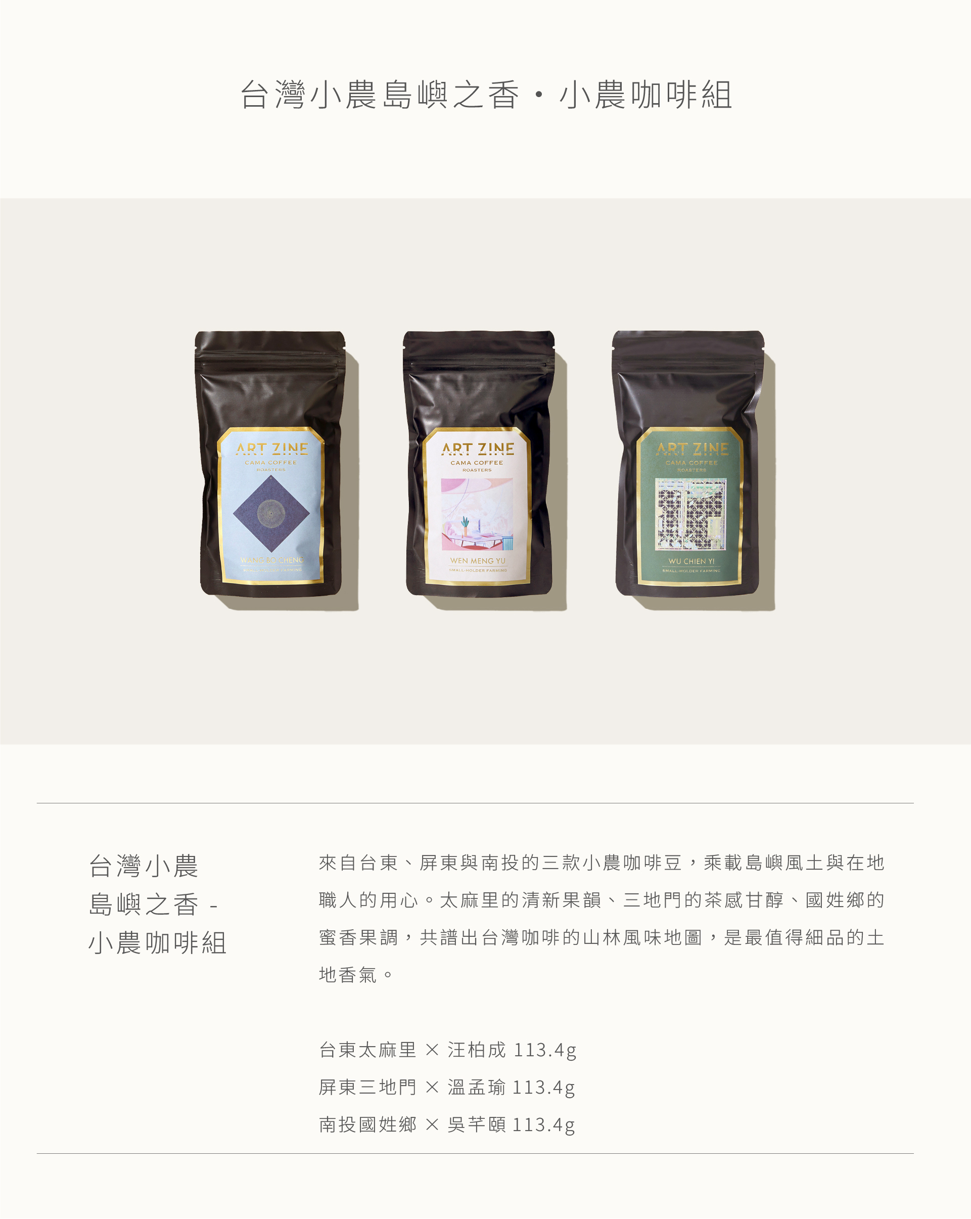 來自台東、屏東與南投的三款小農咖啡豆,乘載島嶼風土與在地職人的用心。太麻里的清新果韻、三地門的茶感甘醇、國姓鄉的蜜香果調,共譜出台灣咖啡的山林風味地圖,是最值得細品的土地香氣。