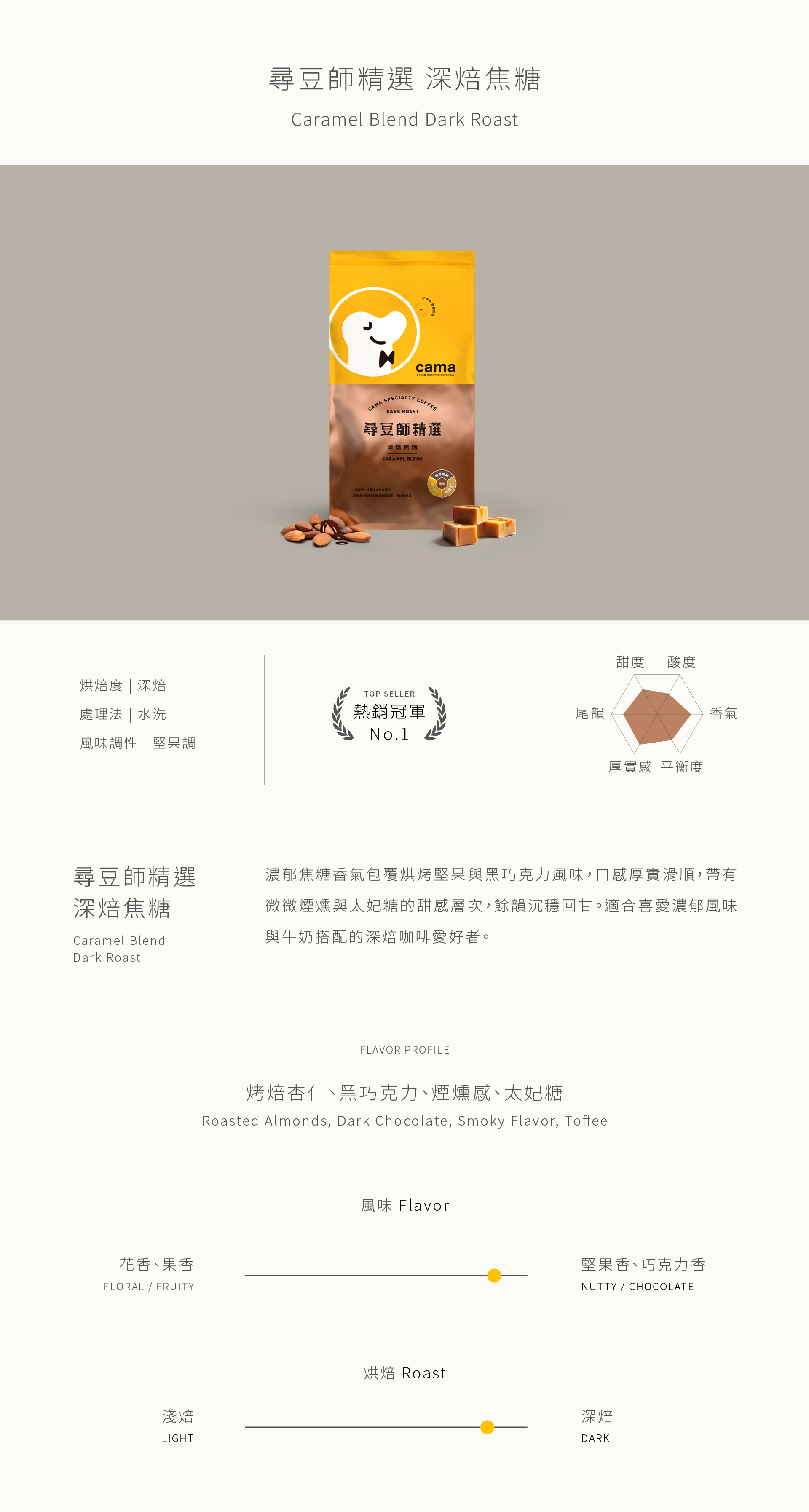 濃郁焦糖香氣包覆烘烤堅果與黑巧克力風味,口感厚實滑順,帶有微微煙燻與太妃糖的甜感層次,餘韻沉穩回甘。適合喜愛濃郁風味與牛奶搭配的深焙咖啡愛好者。