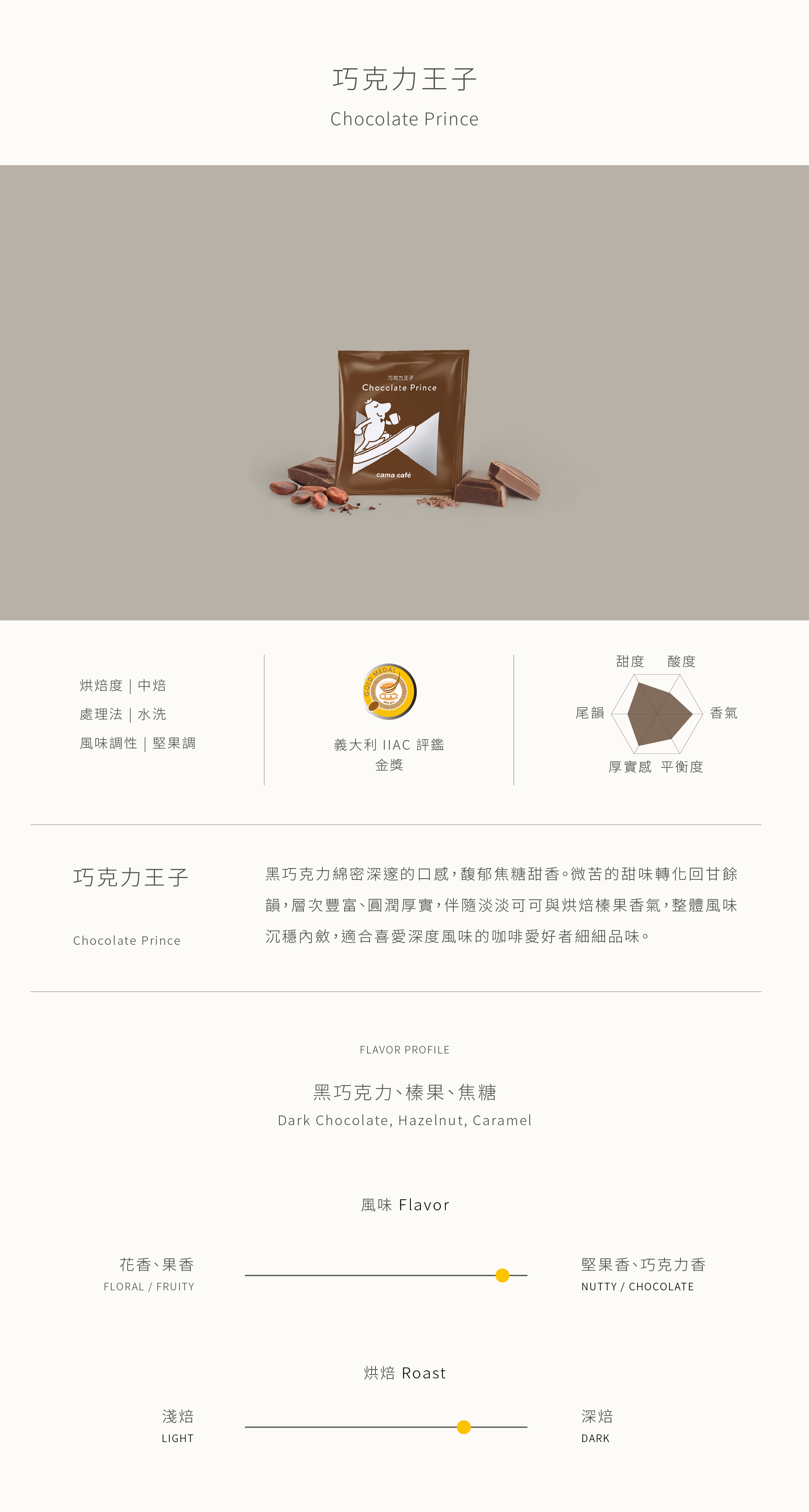 黑巧克力綿密深邃的口感,馥郁焦糖甜香。微苦的甜味轉化回甘餘韻,層次豐富、圓潤厚實,伴隨淡淡可可與烘焙榛果香氣,整體風味沉穩內斂,適合喜愛深度風味的咖啡愛好者細細品味。