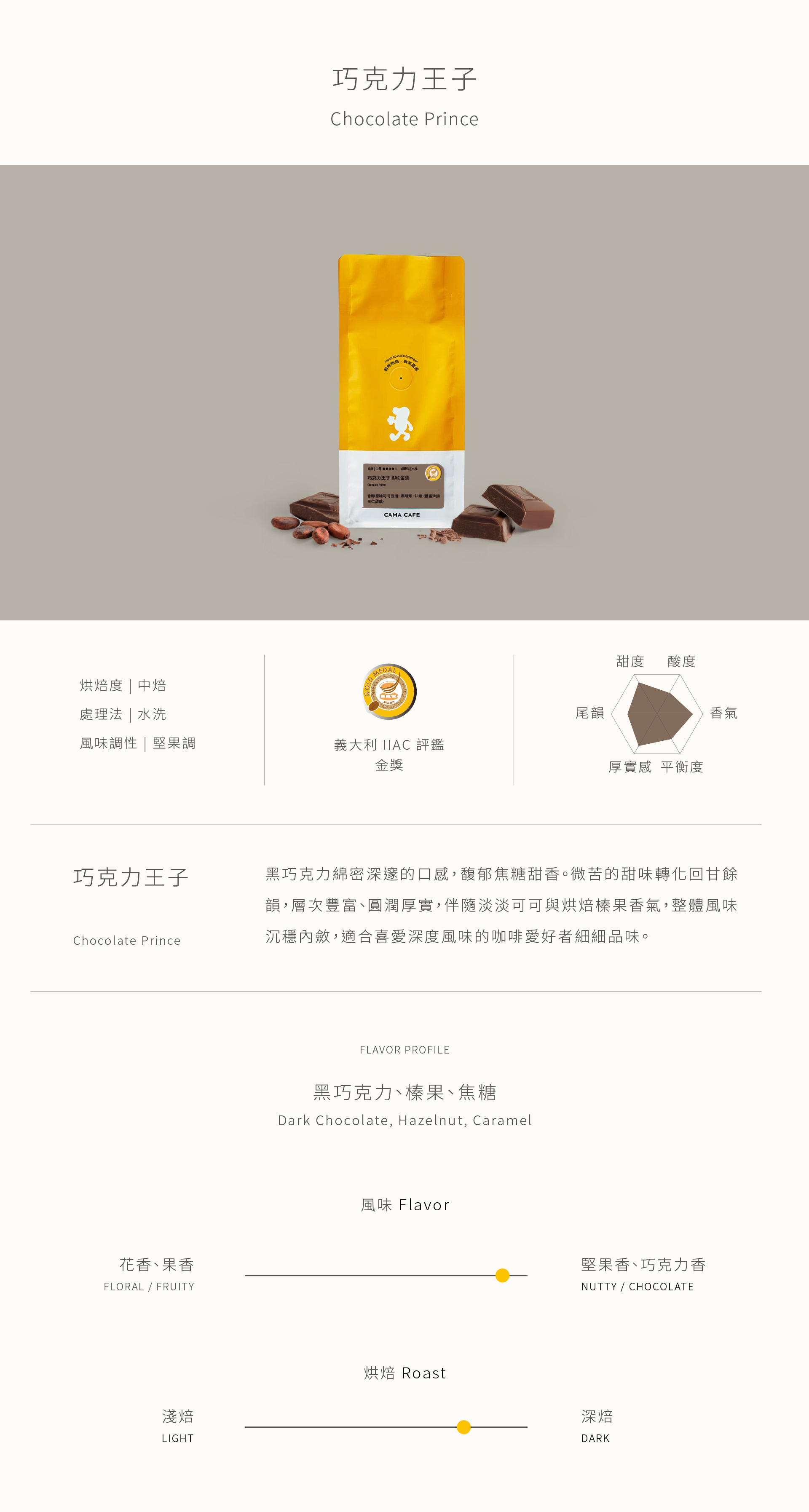 黑巧克力綿密深邃的口感,馥郁焦糖甜香。微苦的甜味轉化回甘餘韻,層次豐富、圓潤厚實,伴隨淡淡可可與烘焙榛果香氣,整體風味沉穩內斂,適合喜愛深度風味的咖啡愛好者細細品味。
