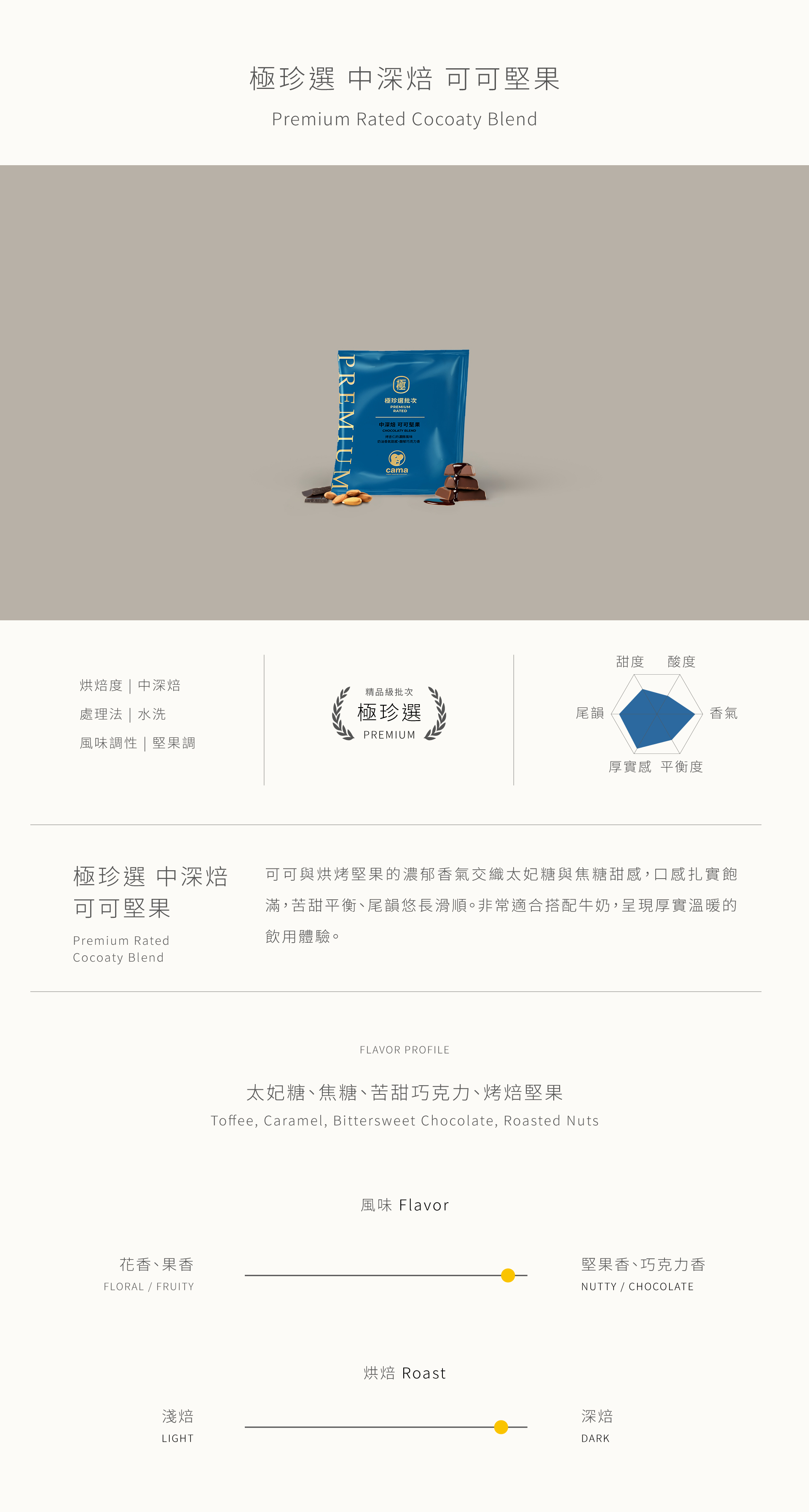 可可與烘烤堅果的濃郁香氣交織太妃糖與焦糖甜感,口感扎實飽滿,苦甜平衡、尾韻悠長滑順。非常適合搭配牛奶,呈現厚實溫暖的飲用體驗。