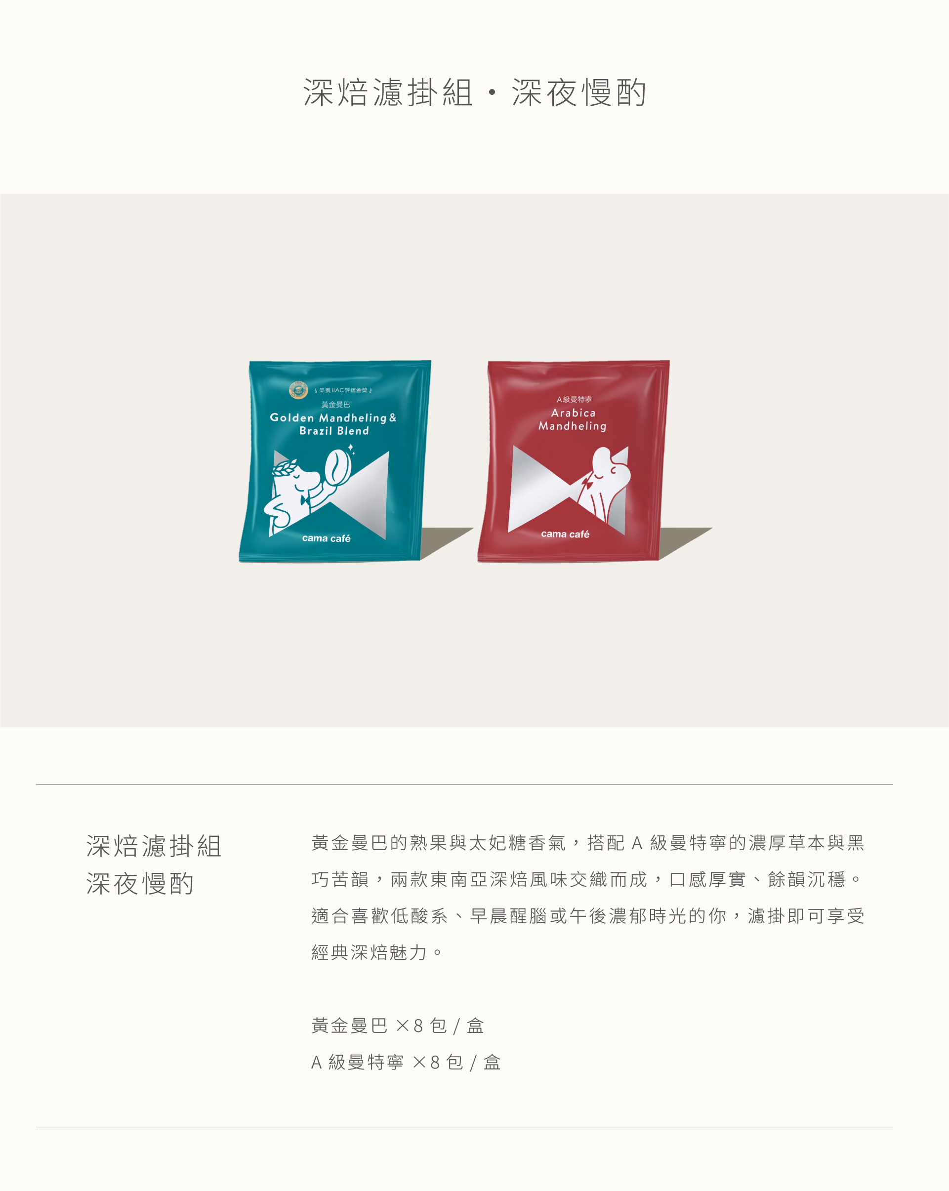 黃金曼巴的熟果與太妃糖香氣,搭配 A 級曼特寧的濃厚草本與黑巧苦韻,兩款東南亞深焙風味交織而成,口感厚實、餘韻沉穩。適合喜歡低酸系、早晨醒腦或午後濃郁時光的你,濾掛即可享受經典深焙魅力。