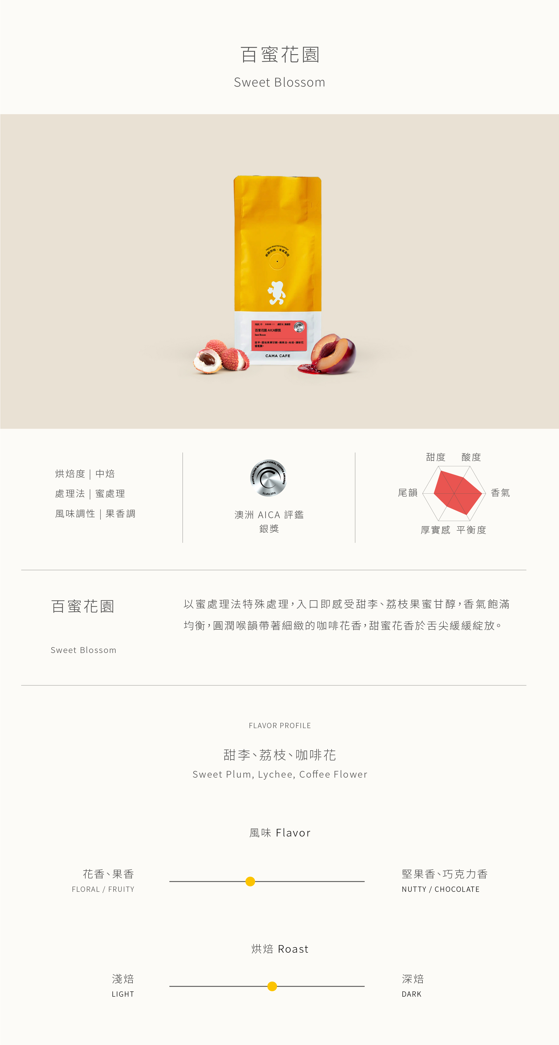 以蜜處理法特殊處理,入口即感受甜李、荔枝果蜜甘醇,香氣飽滿均衡,圓潤喉韻帶著細緻的咖啡花香,甜蜜花香於舌尖緩緩綻放。