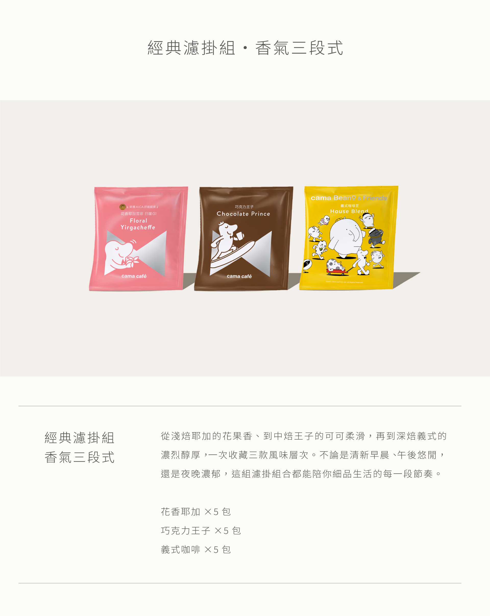 從淺焙耶加的花果香、到中焙王子的可可柔滑,再到深焙義式的濃烈醇厚,一次收藏三款風味層次。不論是清新早晨、午後悠閒,還是夜晚濃郁,這組濾掛組合都能陪你細品生活的每一段節奏。