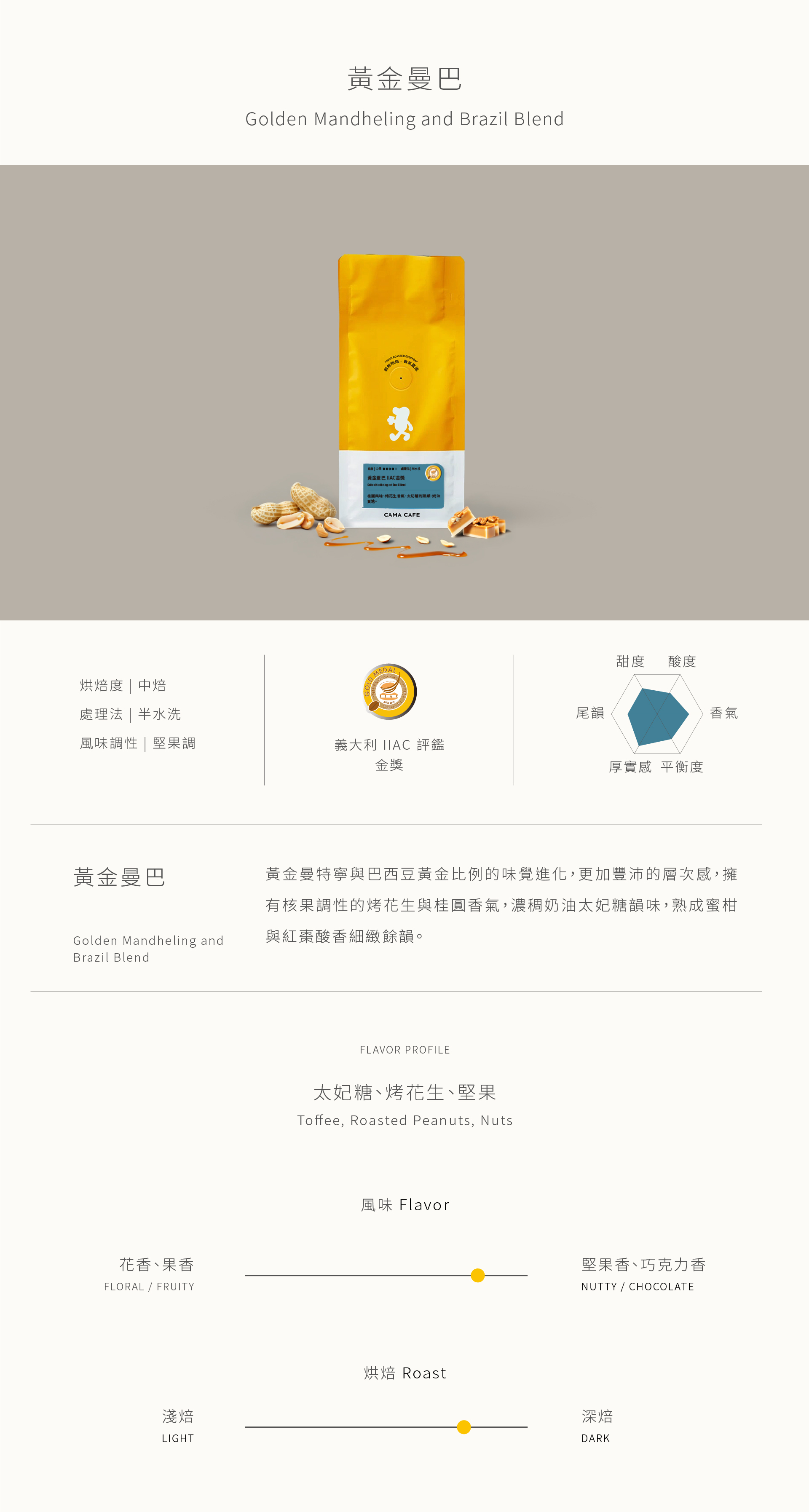 黃金曼特寧與巴西豆黃金比例的味覺進化,更加豐沛的層次感,擁有核果調性的烤花生與桂圓香氣,濃稠奶油太妃糖韻味,熟成蜜柑與紅棗酸香細緻餘韻。